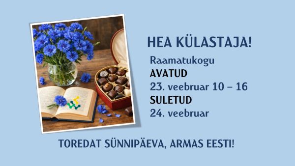 24. veebruaril oleme suletud. Raamatuid saab tagastada peaukse juures olevasse tagastuskasti.