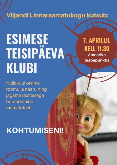Esimese Teisipäeva Klubisse on oodatud kõik raamatuhuvilised. Saame kokku iga kuu esimesel teisipäeval kell 11.30 raamatukogu 2. saali Ameerika teabepunktis, et loetu üle ühiselt arutleda ja avastada enda jaoks seeläbi ka midagi täiesti uut. Igaks tulevaseks kokkusaamiseks mõtleme koos uue teema või autori, kelle loomingust enam teada sooviksime.