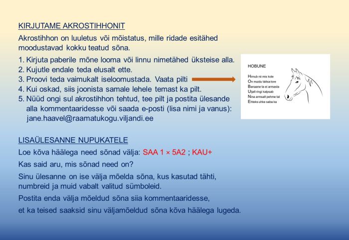 saadavad e-postiga aadressile: jane.haavel@raamatukogu.viljandi.ee