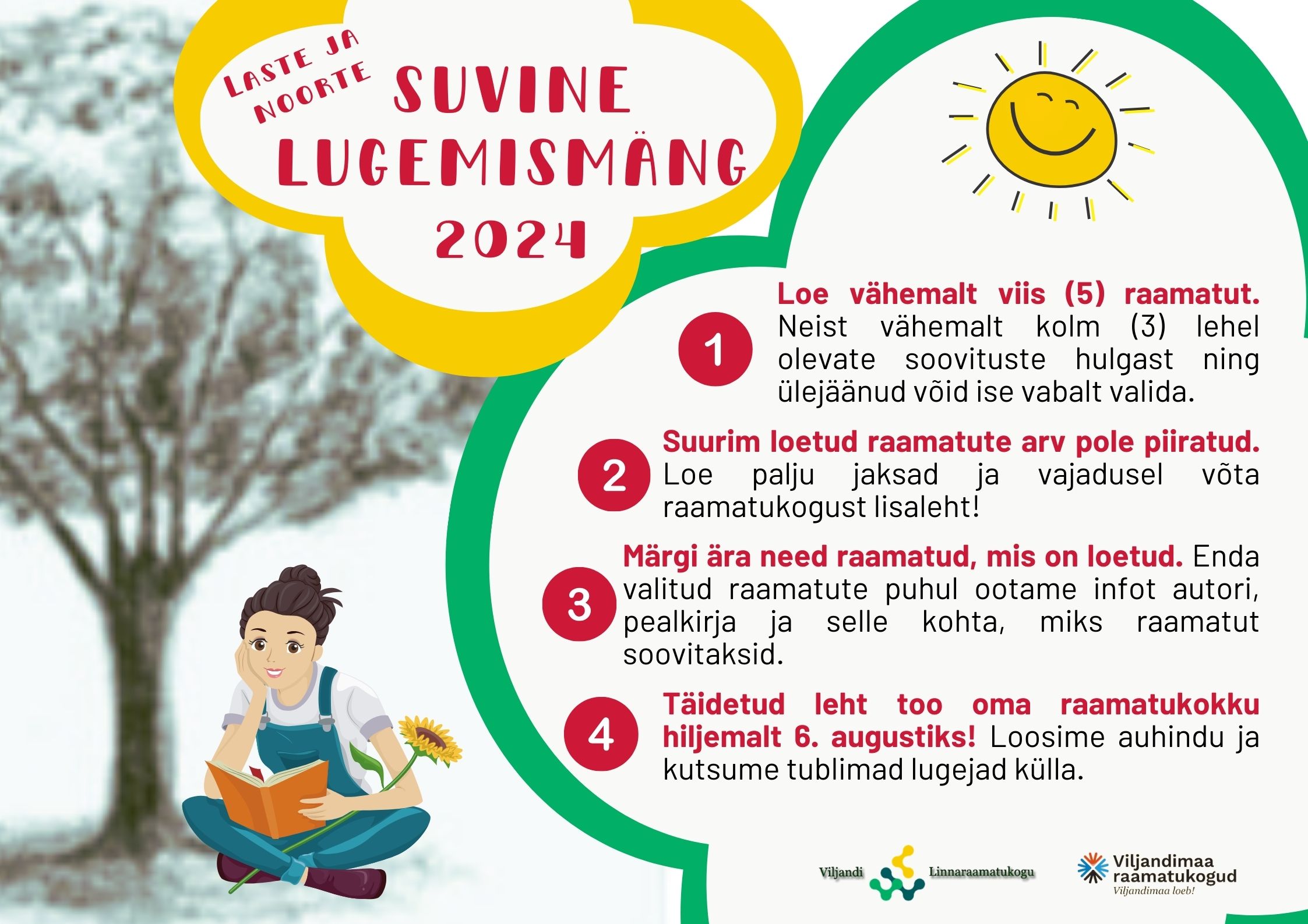 - 8. augustiks 2024 palume raamatukogudel edastada osalenud laste andmed ja parimate osalejate nimed Viljandi Linnaraamatukokku, et saaksime teha neile kutse Viljandis 13. augustil 2024 toimuvale lõpupeole ning loosida auhindu. Peol osalejate arvu piirab meie ruum, seega ei saa praegu ette lubada, et kõik lugejad saavad kutse.