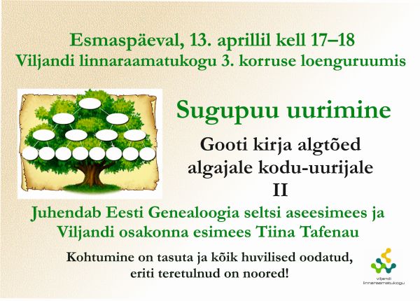 Gooti kirja algtõed algajale kodu-uurijale (II osa). Juhendab Eesti Genealoogia seltsi aseesimees ja Viljandi osakonna esimees Tiina Tafenau.