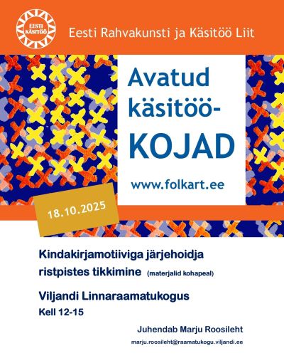 18. oktoobril algusega 12.00 ühendame ristpistega Eesti Raamatu Aasta ja Eesti Rahvakunsti ja Käsitöö Liidu aastateema Rahvarõivas Ruudus. Tikime südamelähedase kindakirja järjehoidjale. Kõik huvilised on oodatud!