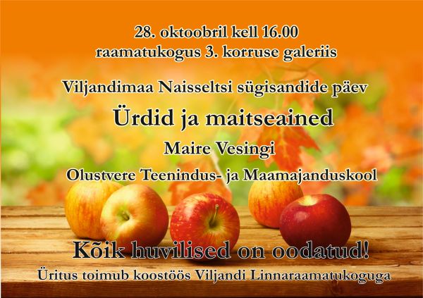 Teisipäeval, 28. oktoobril kell 16.00 olete oodatud Viljandimaa Naisseltsi sügisandide päevale. Selle aasta teemaks on ürdid ja maitseained. Loenguga esineb lektor Maire Vesingi.