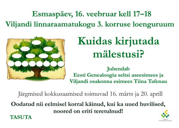 Esmaspäeval, 9. veebruaril kell 17.00 on oodatud raamatukogusse kõik sugupuu uurimise huvilised.