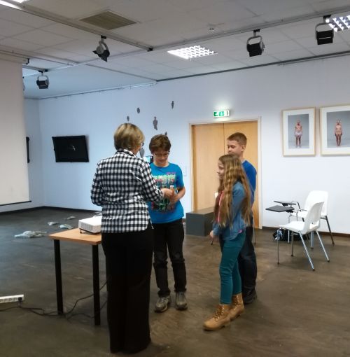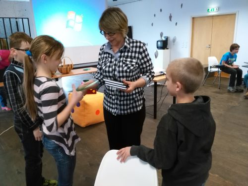 Eesti Lastekirjanduse Keskuse direktor Triin Soone õnnitleb Viljandi Paalalinna Kooli võistkonda 2. koha puhul