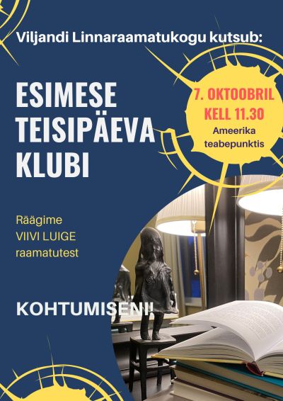 Viljandi Linnaraamatukogu Esimese Teisipäeva Klubi kokkusaamine toimub teisipäeval, 7. oktoobril kell 11.30 Ameerika teabepunktis. Jagame lugemiselamusi Viivi Luige raamatutest. Kohtumiseni!