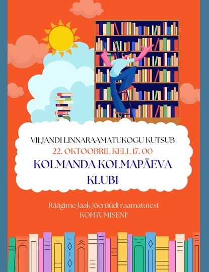Viljandi Linnaraamatukogu Kolmanda Kolmapäeva Klubi uue hooaja järgmine kokkusaamine toimub kolmapäeval, 22. oktoobril kell 17.00! Tutvume Jaak Jõerüüdi loominguga. Kõik uued ja vanad klubilised on oodatud!