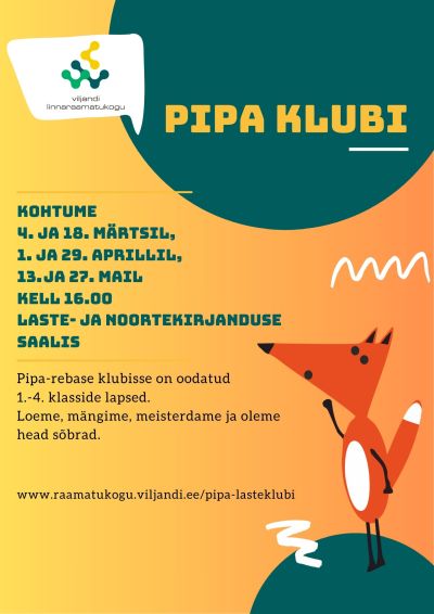 Pipa on Viljandi Linnaraamatukogu maskott - rebane, kes teadagi on üks äraütlemata kaval ja uudishimulik, hooliv ja tark loom. Pipa klubi ongi mõeldud kõigile lastele, kes sooviksid olla nagu rebane Pipa: seiklushimulised avastajad, julged katsetajad, uudishimulikud uurijad, osavad meisterdajad ja lugeda sealjuures lahedaid raamatuid ning leida ja hoida häid sõpru.